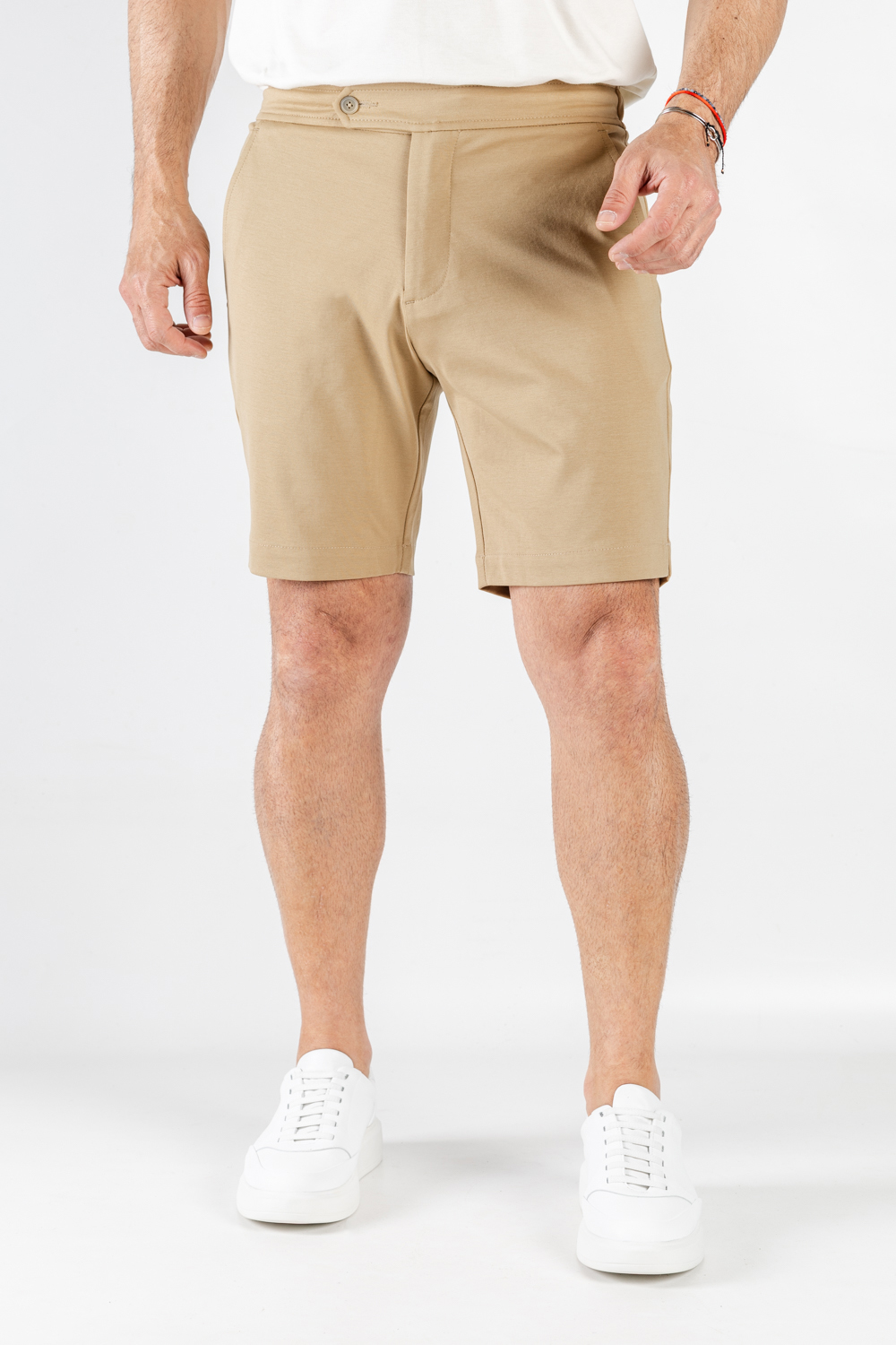 Acabamento de alfaiataria: transpasse de botão e construção limpa, elevando a bermuda a uma peça mais refinada;