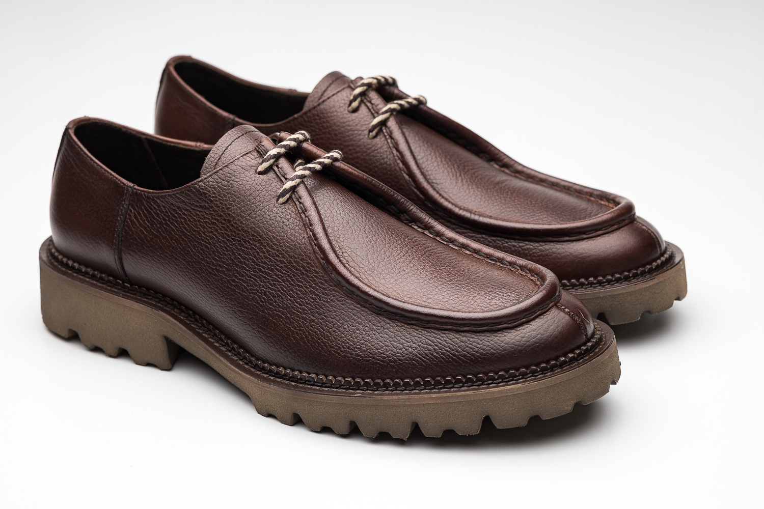 Inspirado no design tradicional dos sapatos robustos, o Canadian combina o requinte do couro com o visual imponente do solado tratorado. O resultado é um calçado que transita entre o casual elegante e o urbano refinado, com destaque para o cadarço listrado em bege e marrom, um detalhe sutil que imprime autenticidade e estilo.